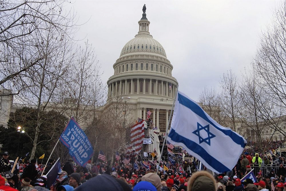 “As thousands gathered in Washington on Jan. 6 for the fateful Donald Trump rally that would end in the storming of the U.S. Capitol, an Israeli flag was spotted in the crowd, flying alongside flags championing the QAnon conspiracy, the III% militia movement, and other popular right-wing causes. “The Bible says, if you bless Israel, you should be blessed,” explained the protestor waving the flag, repeating a Bible verse beloved by the Christian Zionist movement. “So, we’re a nation that supports Israel.” Later, the flag was spotted directly outside the Capitol building during the siege, while another masked protestor sported a black-and-white Israeli flag sown onto his paramilitary vest, beside a pro-police “Thin Blue Line” flag.”